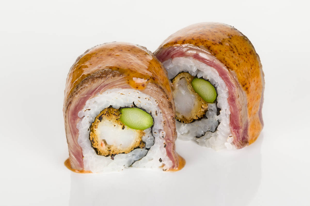 Langostino rebozado y espárrago frito cubierto de ternera y salsa criolla. 8 unidades.